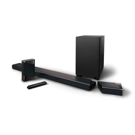 Gracias a la barra de sonido Philips Fidelio, nada se interpondrá entre el momento y tú. Tanto si se trata de sus altavoces posteriores extraíbles, que se pueden poner o quitar en cuestión de segundos durante la noche de cine, como de su sencilla forma de cambiar entre todas tus fuentes favoritas o de su perfil b