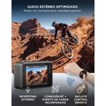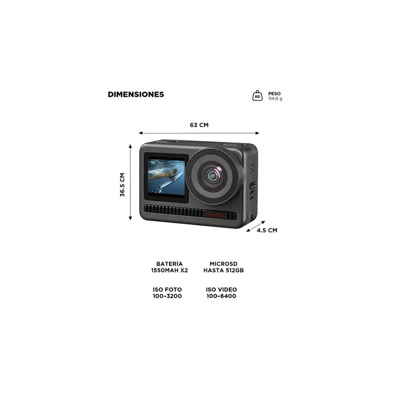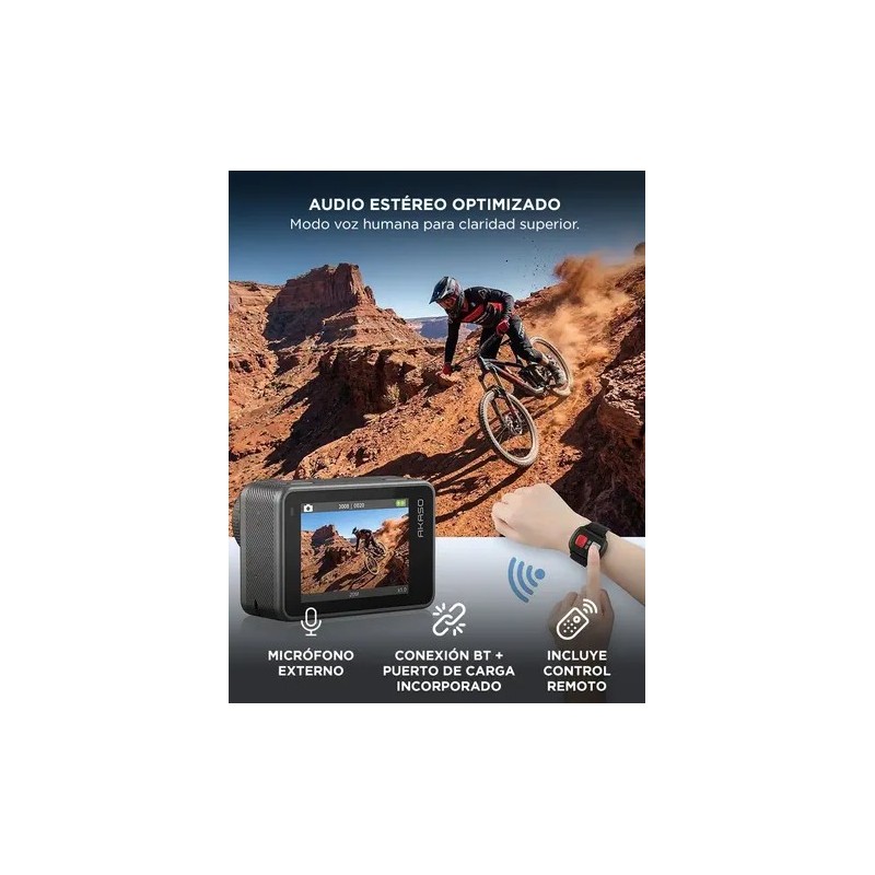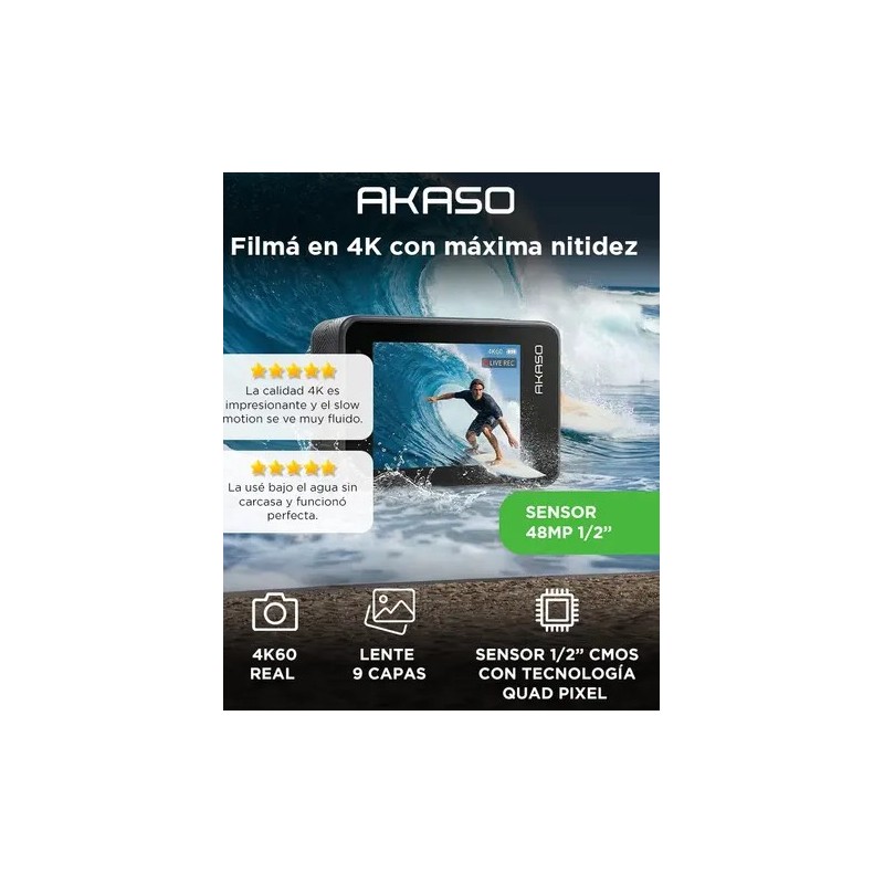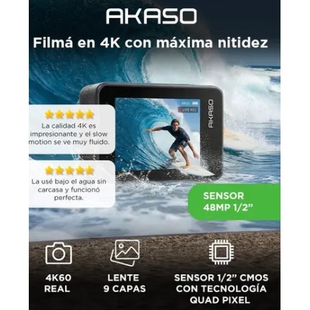 La Camara de Accion AKASO BRAVE 8 incorpora sensor 1/2” CMOS de 48MP que permite grabar en 4K60 con alto nivel de detalle. Ideal para deportes extremos y contenido profesional.