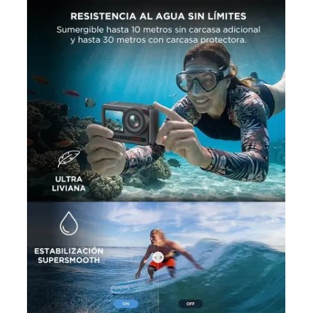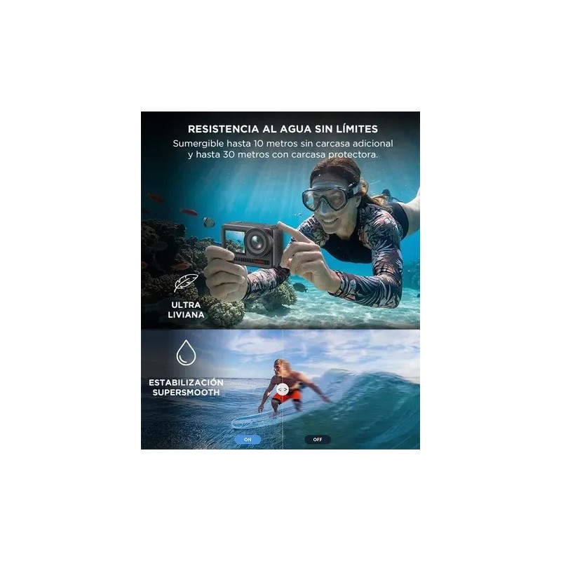 Diseñada para aventura acuática, permite grabar bajo el agua sin necesidad de accesorios adicionales.