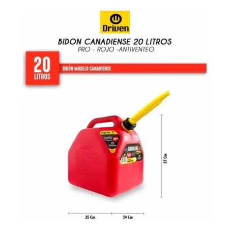 Bidón canadiense de 5 litros homologado para combustible y totalmente hermético. Ideal y práctico para llevar a todos lados en auto, lancha, 4x4 y más! Apto para todo tipo de combustible: nafta, gasoil y diesel. El bidón contiene en su interior un pico vertedor a 45° con sistema anti venteo, esto permite que el combustible salga de manera fluida por el mismo. Incluye traba de seguridad.