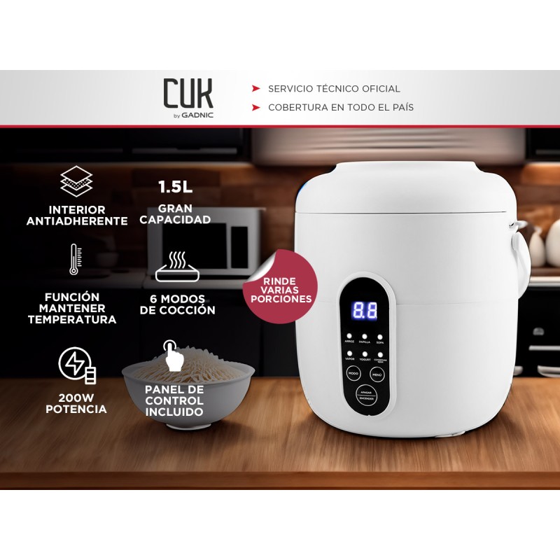 La Arrocera Eléctrica Riceron Gadnic es mucho más que una simple arrocera: es una olla multifunción que te permite preparar una variedad de platos deliciosos de manera rápida y sencilla. Con capacidad para 1.5 litros y funciones de cocción al vapor, esta arrocera es perfecta para cocinar arroz, cereales, sopas, guisos, verduras al vapor y mucho más, todo con un solo electrodoméstico.