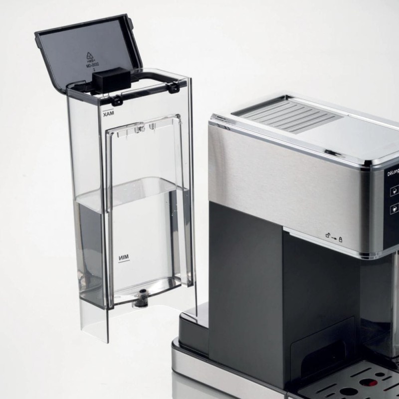 Con su diseño elegante y compacto, esta máquina prepara café o capuchino como en las cafeterías, sin necesidad de grandes espacios. Además, gracias al compartimento situado en la parte trasera de la máquina, siempre tendrás todo ordenado y al alcance.