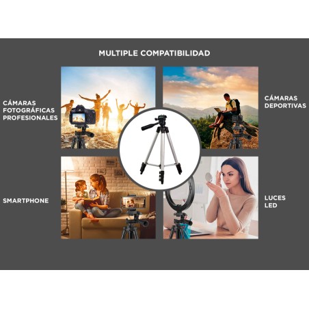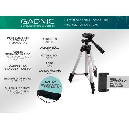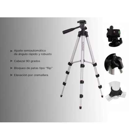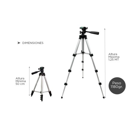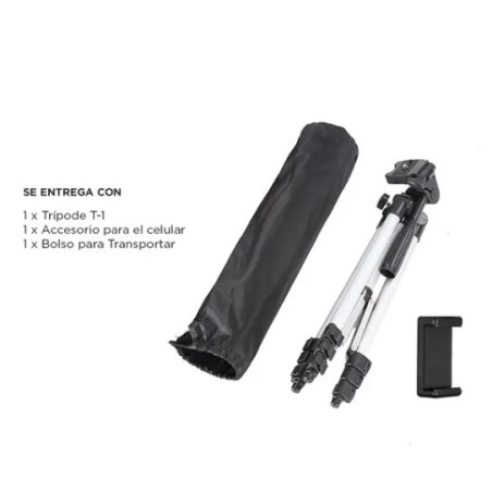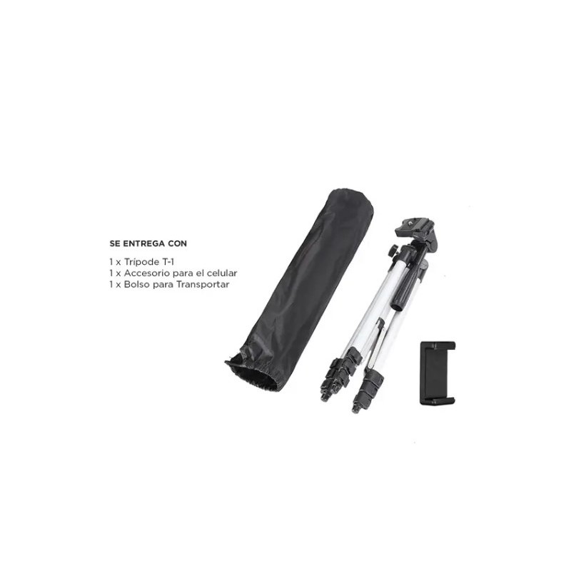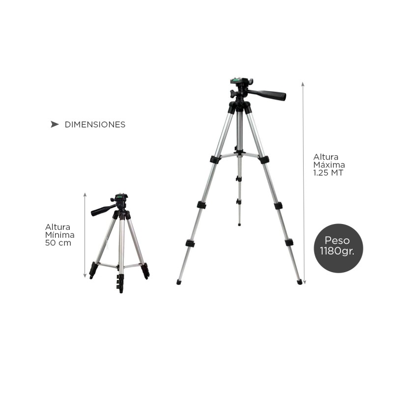 Su carga máxima es de 3 kg y posee un bloqueo de 3 patas de tipo “FLIP” para mayor estabilidad. Cuenta con mecanismo de elevación y un ajuste semi automático de ángulo rápido y robusto. Tiene un cabezal de 90 grados y una resistente estructura de aluminio reforzado. También incluye un accesorio para teléfono, el cual te hará tener las mejores fotos de todas las redes sociales!