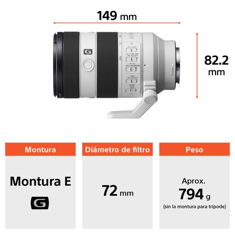 Versátil zoom macro/teleobjetivo de 70-200 mmUn alcance del zoom teleobjetivo extremadamente útil de 70-200 mm facilita la captura de distintos sujetos alejados gracias a su claridad y contraste excepcionales. El FE 70-200 mm F4 Macro G OSS II es una opción excelente para películas y fotografías. Su apertura máxima F4 constante mantiene la exposición uniforme durante el uso del zoom cuando grabas metrajes cinematográficos. Calidad extraordinaria en todas las distancias focalesLa precisión de AA (avanzado asférico) y los elementos de la lente asférica, los tres elementos de cristal ED y el cristal Super ED colaboran en un avanzado diseño óptico para brindar un contraste y una resolución excepcionales de esquina a esquina en todo el alcance del zoom teleobjetivo de 70-200 mm. La calidad de la imagen es inmejorable y uniforme en todas las distancias focales. Nitidez y bokeh inigualables en una misma lenteLa óptica de vanguardia brinda nitidez, claridad, color y contraste impresionantes, mientras que el mecanismo de apertura circular de 9 hojas y la distorsión esférica cuidadosamente optimizada mejoran el bokeh full-frame, que cuenta con una fluidez increíble. Una mezcla con la combinación ideal de resolución y bokeh otorga imágenes profundas y dimensionales. Excelente rendimiento en primer plano Un diseño óptico innovador y con un balance inmejorable brinda la capacidad de macro medio en todo el alcance del zoom de 70-200 mm de la lente. La distancia focal mínima es de 0,26 m en el extremo amplio y de 0,42 m en el extremo teleobjetivo del alcance del zoom; además, cuenta con una ampliación máxima integral de 0,5x para brindar un manejo y una versatilidad sin precedentes cuando captures fotografías o películas. Enfoque automático rápido, preciso y silenciosoCuatro de los motores lineales XD de alta potencia originales de Sony funcionan en conjunto con precisos grupos de enfoque flotante para lograr un control de enfoque increíblemente rápido y exacto. La eficiencia de potencia se mejoró de forma considerable, lo que brinda un aumento de un 20 % en la velocidad de enfoque automático en todo el alcance del zoom cuando capturas fotografías. El seguimiento de enfoque continúa sin interrupciones incluso cuando usas el zoom, lo que garantiza que no se pierdan los momentos importantes de la acción. Diseñado para ofrecer mejores imágenes de películasAlgunas de las características de esta lente están pensadas para lograr imágenes cinematográficas más refinadas. El enfoque manual de respuesta lineal garantiza que el anillo de enfoque responda de forma directa y lineal para obtener un control discreto cuando emplees el enfoque manual, y la avanzada tecnología de la lente reduce la variación del enfoque, además del cambio del eje y enfoque cuando utilices el zoom. Soporte de teleobjetivo sin concesionesSi se utiliza con los teleobjetivos de 2,0x y 1,4x de Sony, aumenta la distancia focal máxima a 400 mm y 280 mm respectivamente. Además, el teleobjetivo de 2,0x posibilita la captura macro 1:1 realista en todas las distancias focales para acceder a un nuevo potencial creativo. Cuando se fija al teleobjetivo de 1,4x, puede capturar imágenes macro de 0,7x como máximo en todas las distancias focales. Diseño compacto, ligero y móvilEste innovador lente tiene un diámetro de 82,2 mm (3-1/4 pulg.) × 149,0 mm (5-7/8 pulg.) de longitud en el extremo amplio del alcance del zoom y pesa 794 gramos (28,1 oz)1. Su diseño extensible maximiza la portabilidad y tiene un interruptor de bloqueo de zoom para evitar la extensión no deseada. Cómodo control creativoAdemás de los interruptores OSS de encendido/apagado y EA/EM de 2 posiciones, se proporcionan interruptores de 3 posiciones del limitador de distancia de enfoque y de selección del modo de estabilización de imagen. Un interruptor distinto activa o desactiva el enfoque manual directo constante para que el enfoque manual se pueda activar de inmediato con tan solo girar el anillo de enfoque cuando captures en el modo EA-C. Revestimiento de flúor del elemento frontalEl elemento frontal del lente cuenta con un revestimiento de flúor que repele huellas digitales, polvo, agua, aceite y otros contaminantes, a la vez que facilita la limpieza de suciedad en caso de que se fijen a la superficie.