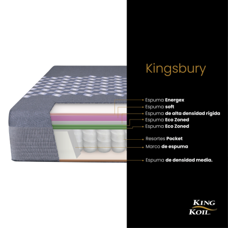 El Colchón Kingsbury y la base de soporte forman un equipo imbatible. La estructura del colchón, con resortes pocket, Eco Zoned y Energex™, se fusiona perfectamente con la base que incorpora una manta de fieltro, capa de espuma y tela antideslizante. La combinación de Hard Foam® y Comfort Grid garantiza un equilibrio perfecto entre firmeza y suavidad.
