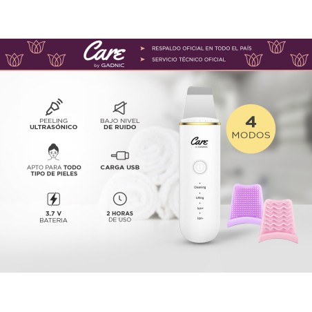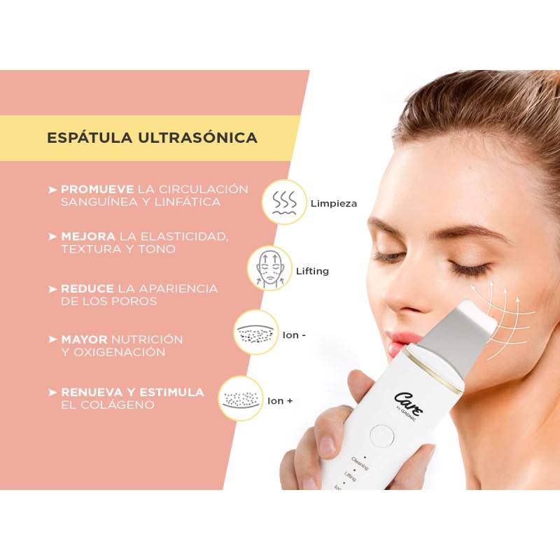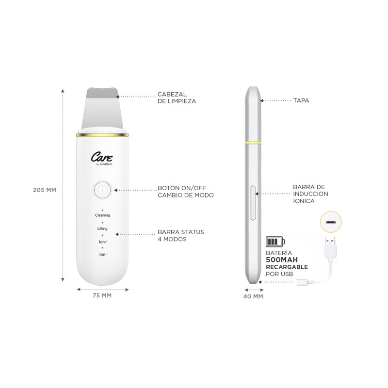 ¡Nueva Espatula Facial Gadnic CL50 Ultrasónica! La Espátula Facial Gadnic CL50 es un dispositivo facial para tratamientos de peeling ultrasónico, de exfoliación, limpieza profunda de la piel, rejuvenecimiento, tonificación y complemento ideal para potenciar los resultados de emulsiones, mascarillas y cremas según tu tipo de piel. Renueva y estimula el colágeno y la generación de las células, reduce la apariencia de los poros, aumenta la elasticidad de la piel y potencia la absorción de los cosméticos utilizados. Sus funciones son aptas para pieles sensibles y adaptable a las nec