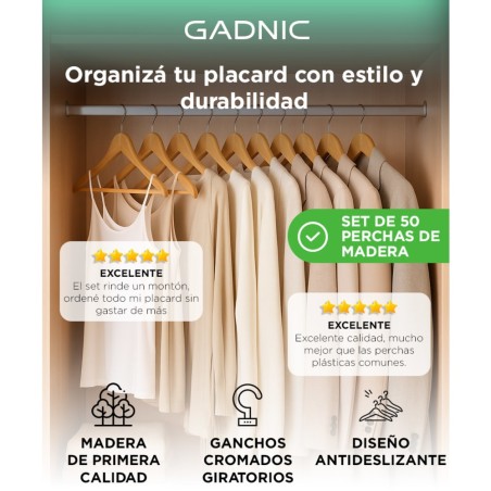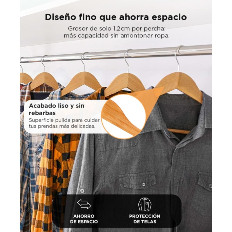 Incluye 50 perchas de madera natural ideales para optimizar el espacio y mantener tu ropa prolija y sin marcas.