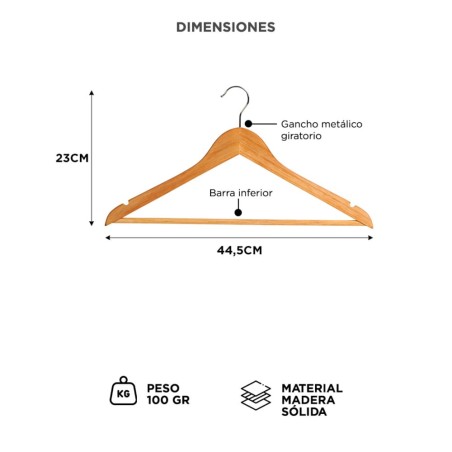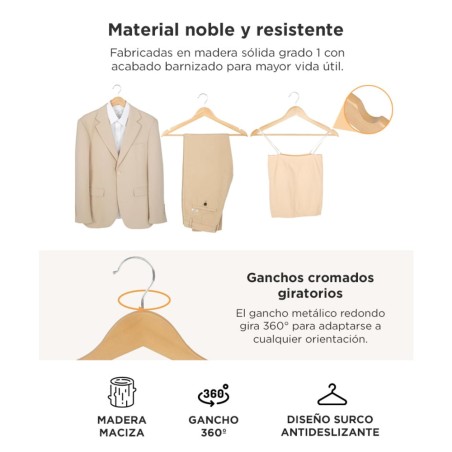 Cada percha está fabricada en madera grado 1 y tratada con barniz protector que mejora su durabilidad y estética.