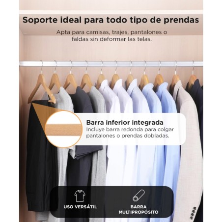 Perfectas para camisas, sacos o pantalones, ya que incluyen barra integrada para colgar prendas de forma segura.