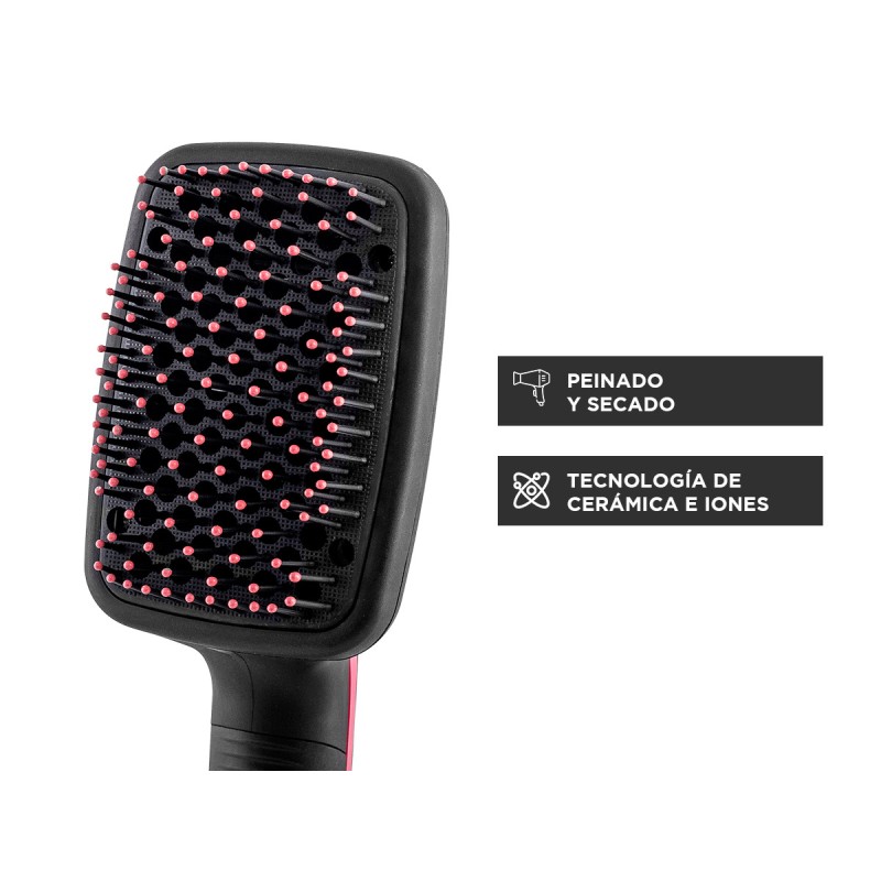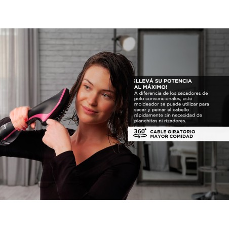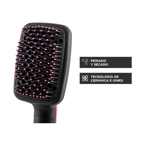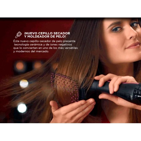 Éste nuevo cepillo-secador de pelo presenta tecnología cerámica y de iones negativos que lo convierten en uno de los más versátiles y modernos del mercado. La potencia de este modelador de pelo puede variar según el lugar de uso, llega a los 1100W de potencia de secado. A diferencia de los secadores de pelo convencionales, este moldeador se puede utilizar para secar y peinar el cabello rápidamente sin necesidad de planchitas ni rizadores.