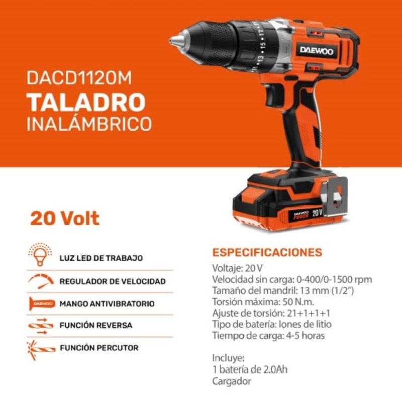 Taladro Percutor Inalámbrico Daewoo 20v 13mm DACD1120M c/ Maletín + Accesorios