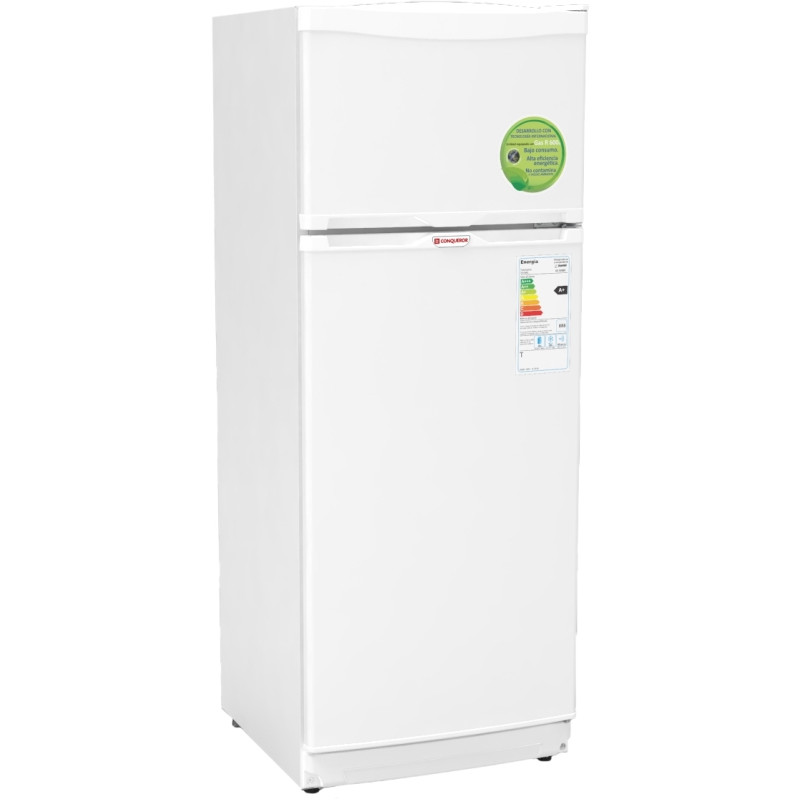 HELADERA CON FREEZER 2F-1200Ba 239L BLANCA CONQUEROR -Volumen bruto refrigerador 179 ltrs -Volumen bruto freezer 60 ltrs -Volumen util refrigerador 176 ltrs -Volumen util freezer 60 ltrs -Peso Neto 45,50 kg -Peso Bruto 46,70 kg -Color Blanca -Medidas sin embalaje (ProfxAnxAl) 67 x55,5 x 147 cm -Evaporador principal: tubo sobre lamina plastica -Evaporador sec.:Skin sobre refrigerador -Condensador: Horizontal alambre externo -Consumo 294kwh/a¦±o -Tipo de refrigerante R-600 -Clase climatica T -Clasificaci¦nn Energetica A+ -Termostato Mecanico en refrigerador -Nivel de ruido aereo 45 db(A) -Est