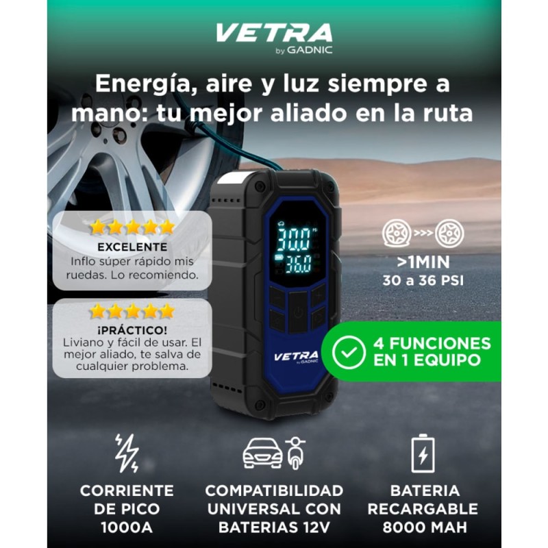 La batería interna de 29.6 Wh (2000 mAh x4) convierte al Vetra en un cargador portátil de gran autonomía. Gracias a su puerto USB-C bidireccional, podés cargar celulares, tablets, GPS o cámaras deportivas en cualquier lugar, sin depender de enchufes.