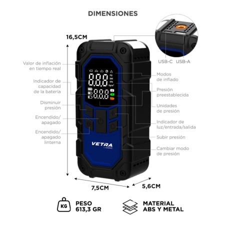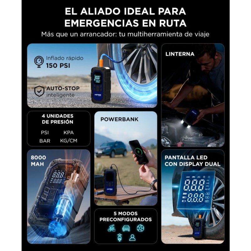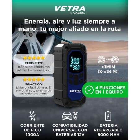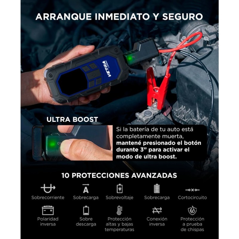 Olvidate de quedar varado por una batería descargada. Con una corriente de arranque de 400 A y un pico de 1000A, este dispositivo
