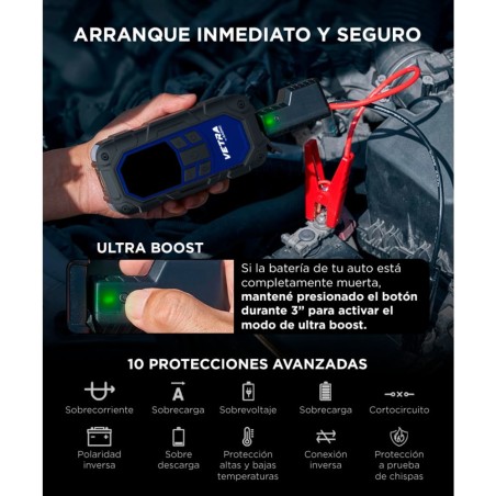 Olvidate de quedar varado por una batería descargada. Con una corriente de arranque de 400 A y un pico de 1000A, este dispositivo puede encender motores de 12V en segundos. Su sistema de protección contra polaridad inversa asegura un uso seguro incluso en condiciones de poca visibilidad.