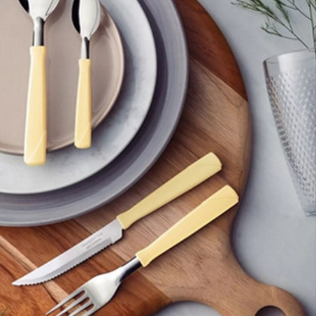 Juego de 24 cubiertos Tramontina color marfil. Incluye 6 tenedores, 6 cuchillos, 6 cucharas soperas y cucharitas de te.