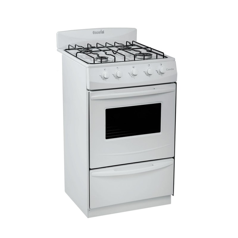 La cocina Escorial está totalmente enlozada en polvo electroestático y cuenta con puerta de horno con visor; bisagra desmontable y reja de plancha con apoya ollas. Por otro lado, dispone perillas de plástico inyectado, manija de plástico, respaldo extraible, horno y parrilla con sistema fácil limpieza (easy to clean).