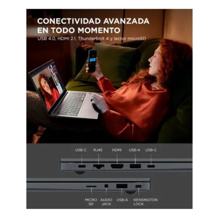 Ofrece una amplia variedad de puertos como HDMI, USB-A, USB-C, ranura micro-SD y RJ45, permitiendo conectar múltiples dispositivos fácilmente.