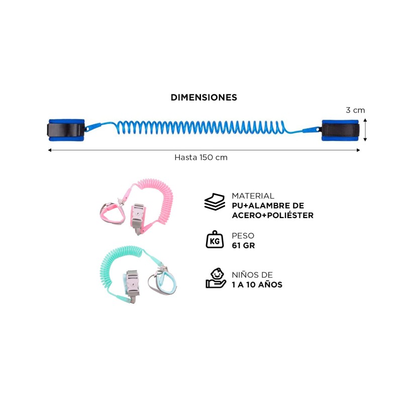 Nuestra Muñequera Guía está construida con materiales de alta calidad que garantizan durabilidad y comodidad. El cierre ajustable se adapta cómodamente a cualquier tamaño de muñeca infantil. Diseñada ergonómicamente para brindar comodidad tanto a los padres como a los niños. La pulsera se ajusta fácilmente a la muñeca del niño y se conecta de manera segura a la del adulto.