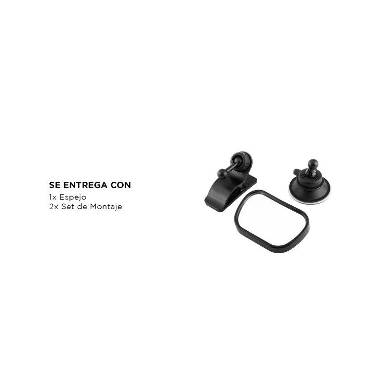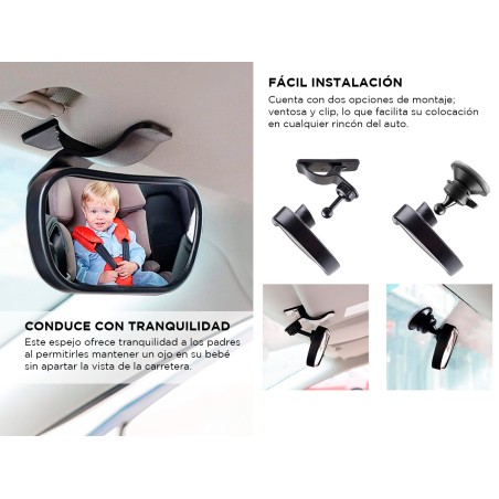 Cuenta con dos opciones de montaje; ventosa y clip, lo que facilita su colocación en cualquier rincón del auto y no te resultará un problema. También puede girar 360°, lo que facilita el ajuste del ángulo de visión. El espejo es convexo, lo que permite un campo de visión más amplio.