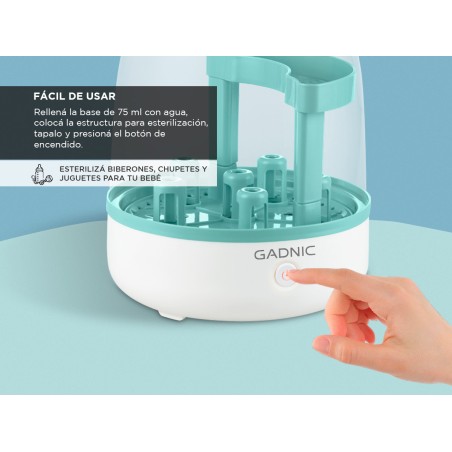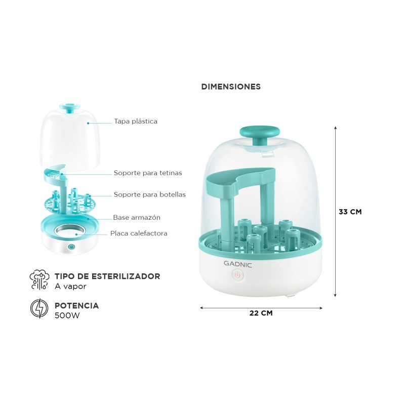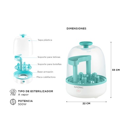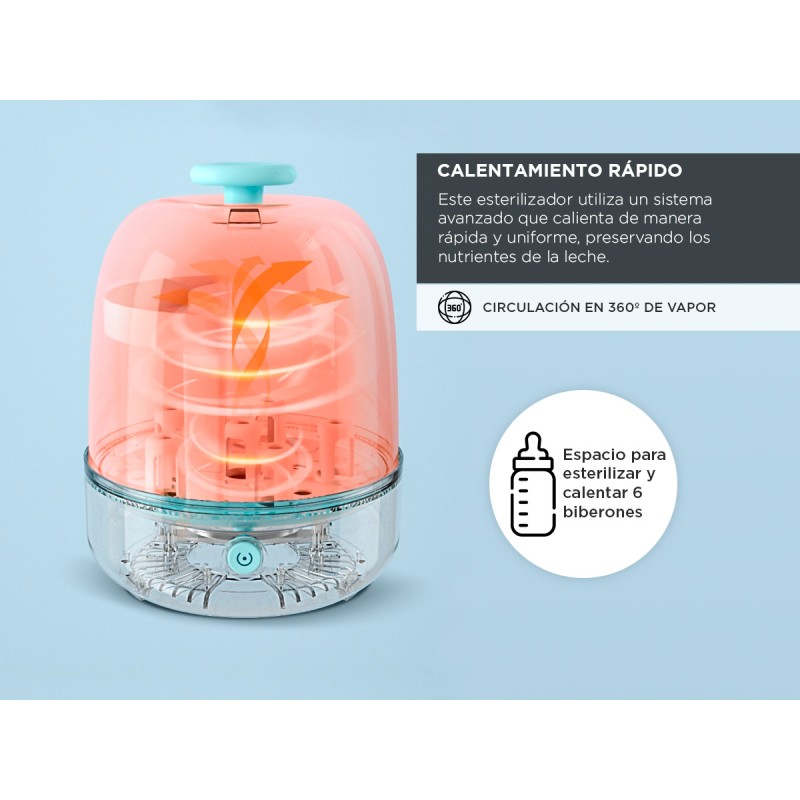 Diseño inteligente: Compacto y moderno, se adapta fácilmente a cualquier espacio en tu cocina. Su capacidad generosa permite esterilizar varios biberones a la vez, optimizando tu tiempo.