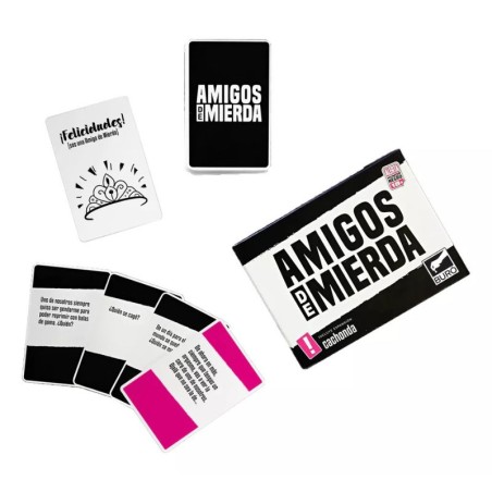 En Amigos de Mierda va a ganar el peor de ustedes ¡Pero lo van a señalar los demás! En cada ronda las cartas te van a preguntar, por ejemplo: En un apocalipsis zombie ¿cuál de tus amigos sería el primero en morir? y a la cuenta de 3 todos deben señalar a alguien, el que tenga más votos se queda con la tarjeta. Con 5 tarjetas... "ganás".