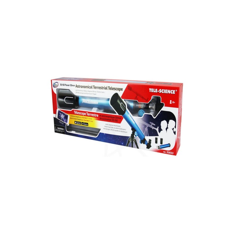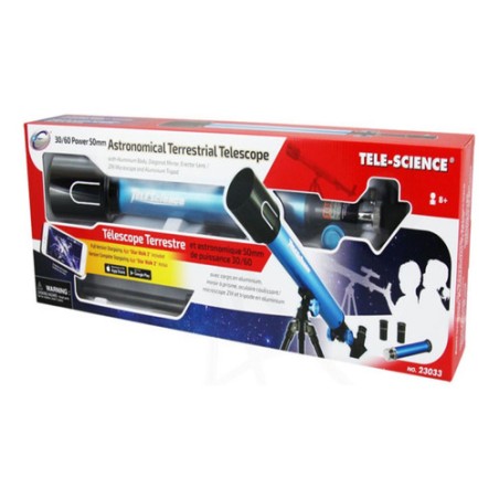 Cuenta con las siguientes características: Tele-Science 30/60 Power 50 mm,2 oculares de 16,6 mm y 8,3 mm, distancia focal de 500 mm, diámetro del objetivo es de 50 mm.
