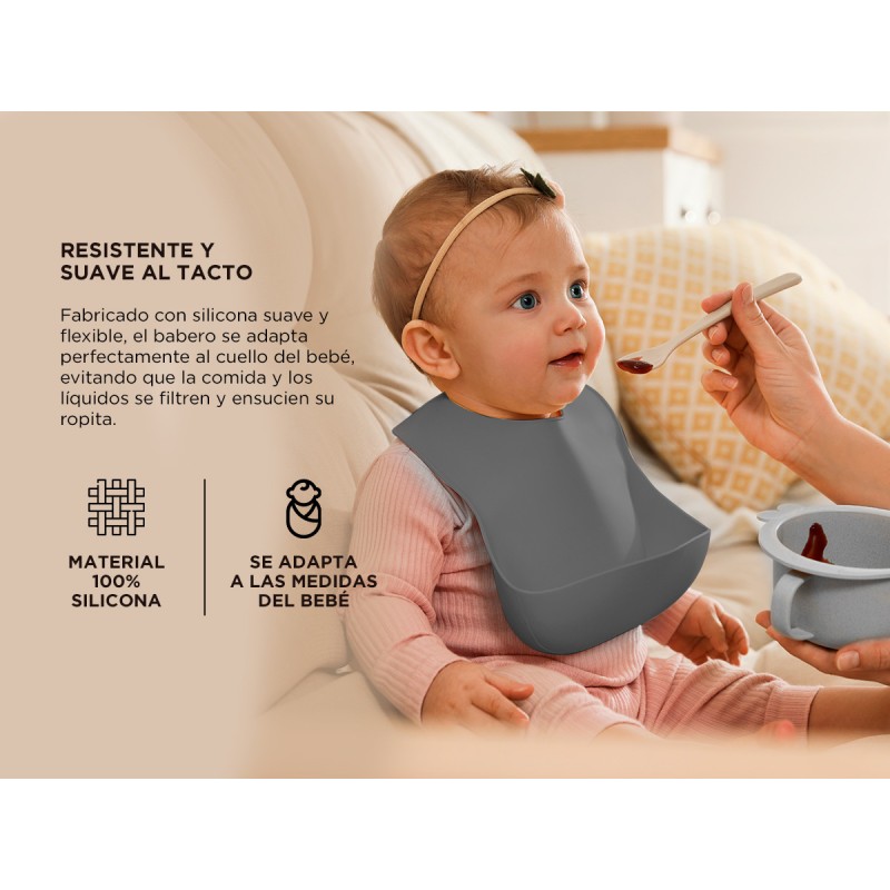 Fabricado con silicona suave y flexible, el babero se adapta perfectamente al cuello del bebé, evitando que la comida y los líquidos se filtren y ensucien su ropita. El práctico bolsillo ajustable captura cualquier alimento que caiga, manteniendo el área de alimentación limpia y ordenada.