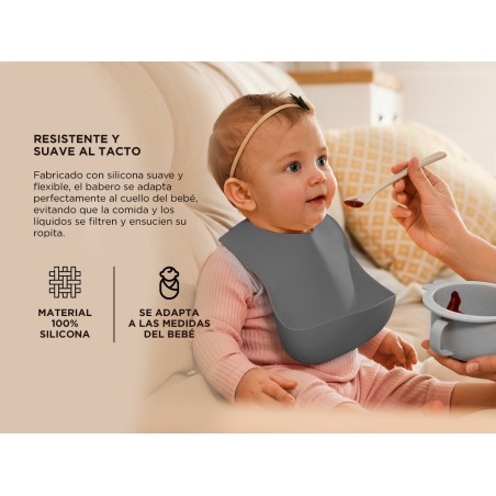 Fabricado con silicona suave y flexible, el babero se adapta perfectamente al cuello del bebé, evitando que la comida y los líquidos se filtren y ensucien su ropita. El práctico bolsillo ajustable captura cualquier alimento que caiga, manteniendo el área de alimentación