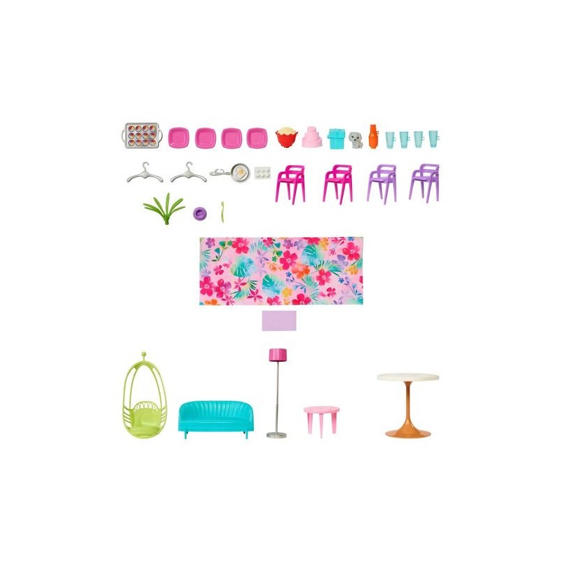 Casa de Vacaciones de Barbie: Este set de juego de 2 pisos ofrece 6 zonas de juego (dormitorio, baño, cocina, comedor, sala de estar y armario) y más de 30 accesorios, incluido un perrito. Cuenta con funciones interactivas como un columpio que también es un ascensor y una pared móvil para transformar la sala en una noche de películas o una fiesta. Además, las literas desplegables permiten recrear fiestas de pijamas. Todo se pliega para un fácil almacenamiento y transporte. Ideal para niñas de 3 años en adelante.