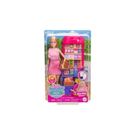 Las imaginaciones pueden cocinar todo tipo de historias con la muñeca y el juego Malibu at the Market. Inspirado en la película Barbie y Teresa Recipe for Friendship, el juego con temática de comida permite a los niños decidir qué hay en el menú. El stand del mercado tiene un diseño colorido y estantes para exhibir alimentos y bebidas. Once accesorios temáticos incluyen una cesta de la compra, caja de productos y escáner de tarjetas para un juego realista. La muñeca "Malibu" de Barbie lleva un lindo atuendo rosa y zapatillas de deporte para su viaje a la tienda.
