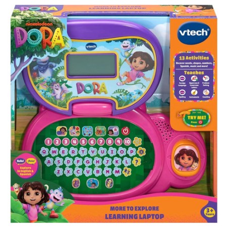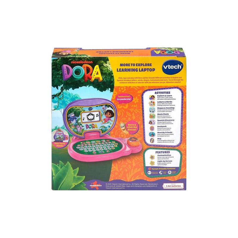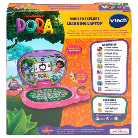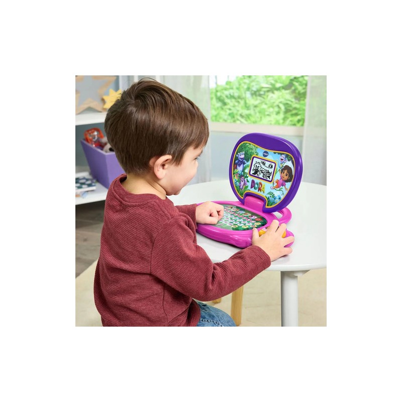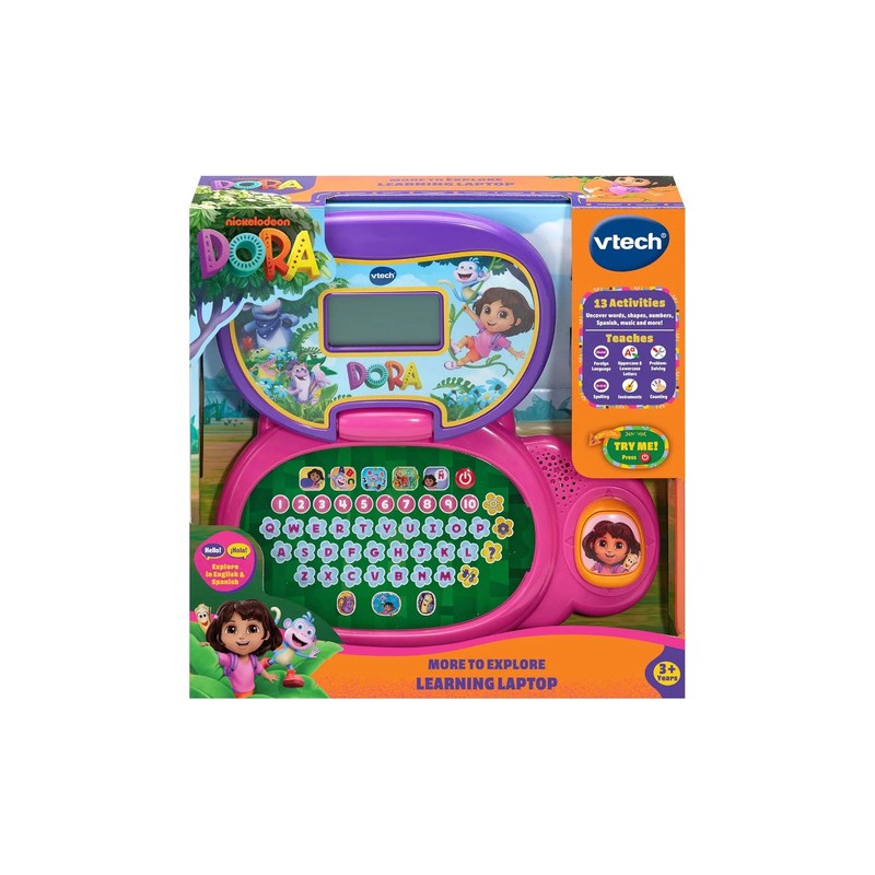 Este primer portátil LCD convierte cada clic en una aventura de aprendizaje junto a Dora, Mochila y Mapa. Con 12 actividades descubre letras, números, formas e instrumentos mientras cuenta en español… ¡y también en francés! Cinco modos —Letras, Números, Vocabulario, Música y Personajes— permiten elegir el reto del día, reforzando el lenguaje, las primeras sumas y la memoria de forma lúdica. El teclado ABC y las diez teclas numéricas enseñan a localizar cada símbo