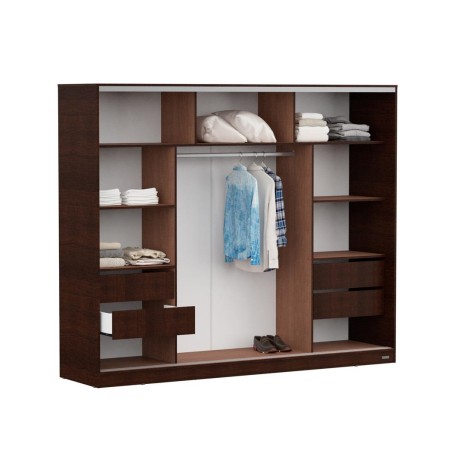 El interior esta pintado en fondo blanco. proporcionando un ambiente luminoso y facilitando la visibilidad de tus prendas. Cuenta con 3 puertas corredizas con guia metalica para un deslizamiento suave y silencioso. Ademas. incluye 4 cajones con correderas metalicas que ofrecen espacio adicional de almacenamiento.