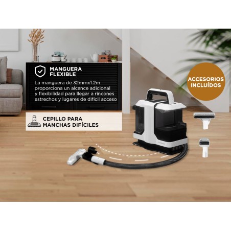 Además, incluimos accesorios prácticos como un cepillo para manchas difíciles y una boquilla para tapicería de ángulo recto, que facilitan la limpieza de sofás, alfombras y otras superficies. Su diseño ligero y la manguera flexible de 32mmx1.2m hacen que sea fácil de manejar y llegar a todos los rincones.