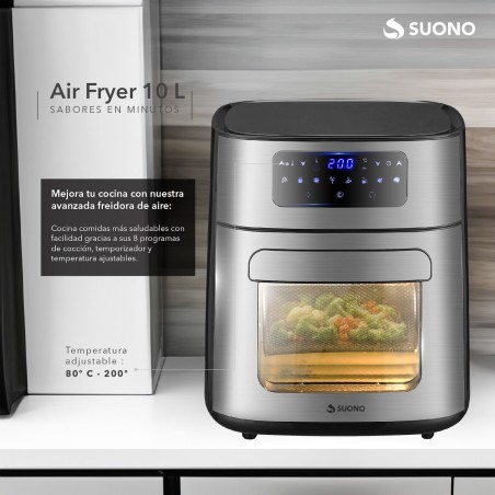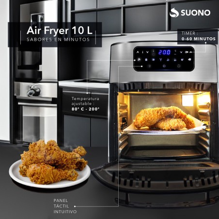 La Airfryer Digital con ventana de 10 litros de la marca Suono representa la innovación en la cocina moderna, combinando la practicidad de la tecnología digital con la conveniencia de una generosa capacidad de 10 litros. Esta freidora de aire no solo simplifica el proceso de cocción, sino que también permite observar el progreso gracias a su ventana transparente, ofreciendo una experiencia culinaria única.