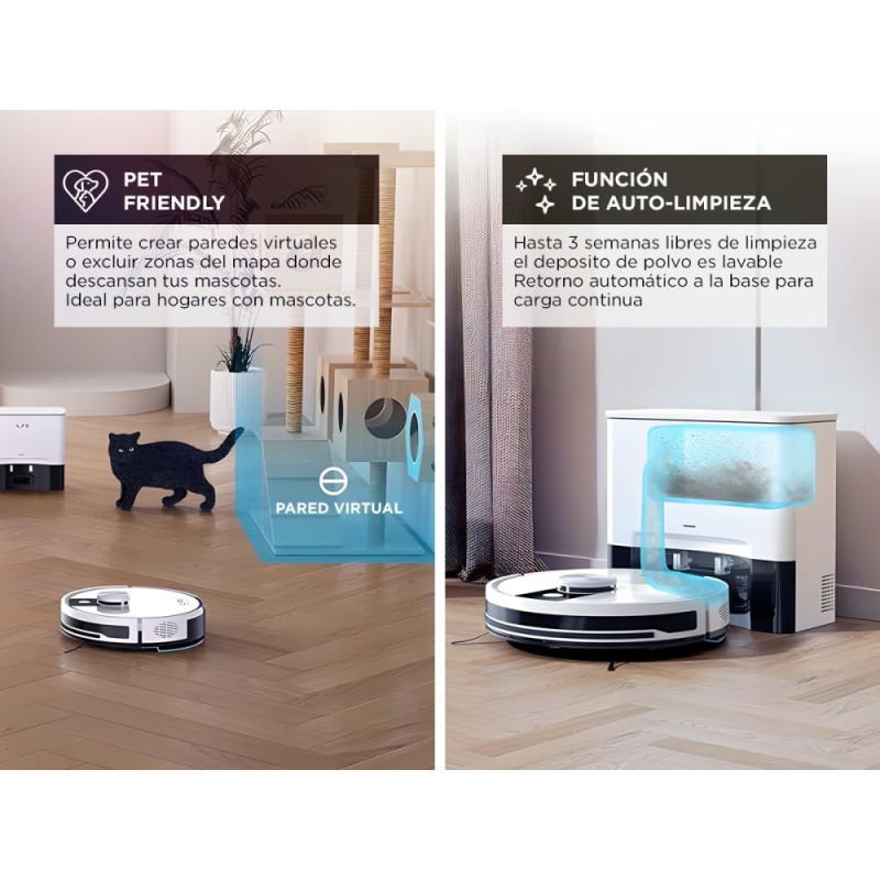 Su potente succión de alta eficiencia, junto con la función trapeadora, garantiza una limpieza profunda en todo tipo de pisos. Además, el sistema de autovaciado reduce al mínimo el mantenimiento, mientras que su control desde app te permite gestionarla estés donde estés.