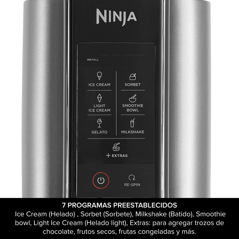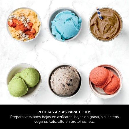 7 PROGRAMAS: Ice Cream (Helado) , Sorbet (Sorbete), Milkshake (Batido), Smoothie bowl, Light Ice Cream (Helado light), Extras: después de batir, distribuye uniformemente trozos de chocolate, frutos secos, frutas, etc m por todo el postre.
