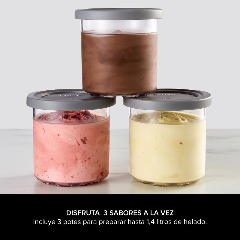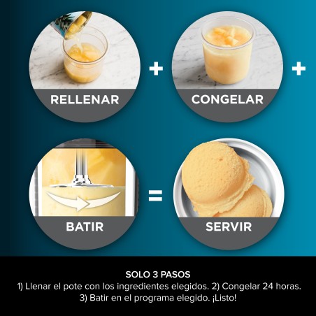 1) Llenar el pote con los ingredientes elegidos. 2) Congelar 24 horas. 3) Batir en el programa elegido. ¡Listo!