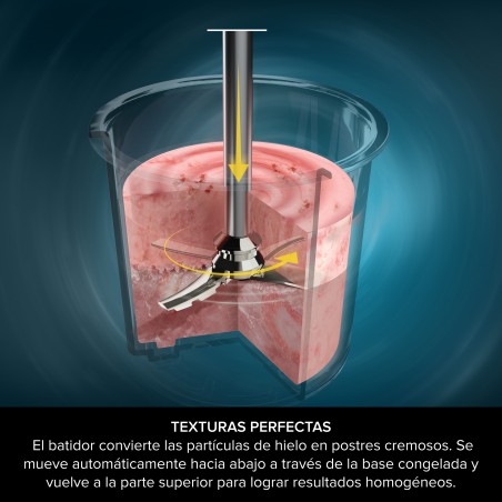 El batidor convierte las partículas de hielo en postres cremosos congelados en cuestión de minutos. Se mueve automáticamente hacia abajo a través de la base congelada y vuelve a la parte superior para lograr resultados homogéneos.