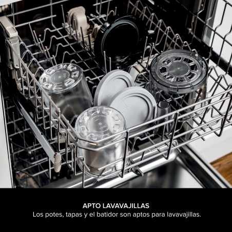 Los potes, tapas y el batidor son aptos para lavavajillas.