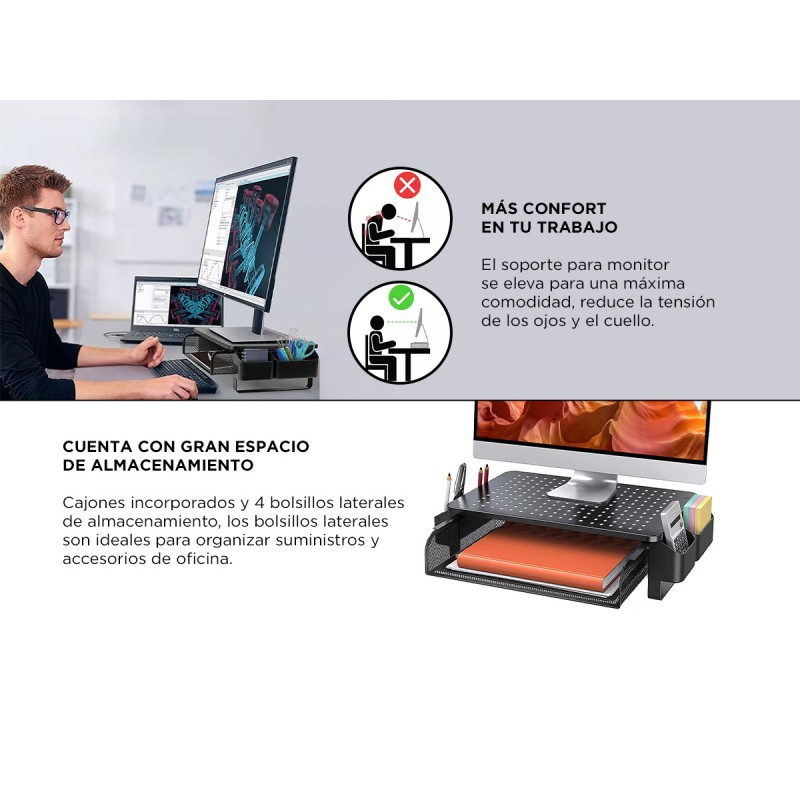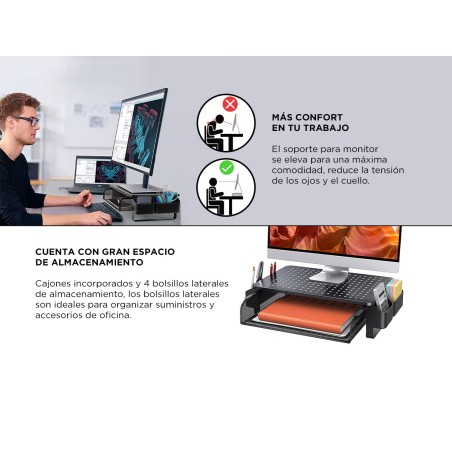 El soporte para monitor, computadora o impresora presenta un diseño moderno y elegante que eleva su monitor para una máxima comodidad, reduce la tensión de los ojos y el cuello, tiene espacio debajo para un teclado, un práctico cajón para papel adicional e incluso tiene espacio para el compartimiento de suministros de oficina. Este soporte seguramente hará que toda su oficina envidie.