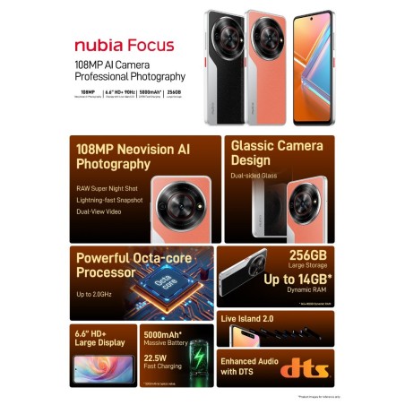 Disfrutá de la fluidez del Nubia Focus 4G con pantalla AMOLED de 6.6'' y 4 GB de RAM, ideal para consumo multimedia y redes sociales. Su batería de 5000 mAh permite uso prolongado sin recargas frecuentes. Diseño elegante en color negro, perfecto para uso diario y portabilidad.