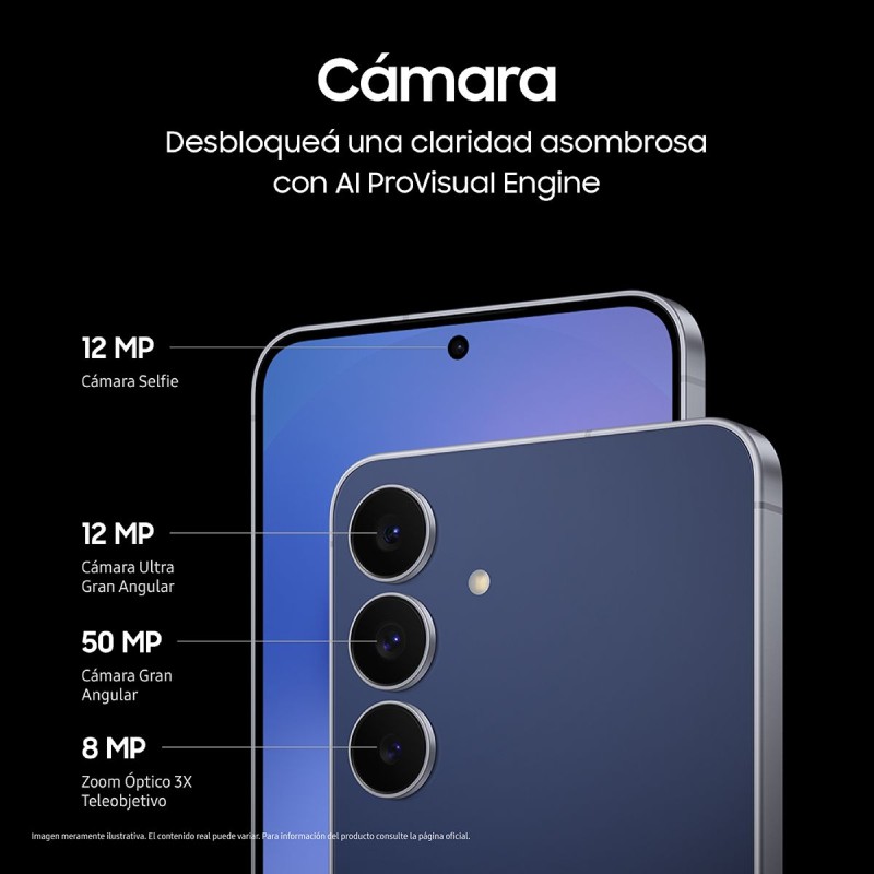 En fotografía, el S25 FE demuestra potencia profesional. Su sistema de triple cámara trasera combina un sensor principal de 50 MP (OIS), un ultra gran angular de 12 MP y un teleobjetivo de 8 MP con zoom óptico 3x, logrando imágenes nítidas, colores reales y excelente desempeño en baja luz gracias al ProVisual Engine.